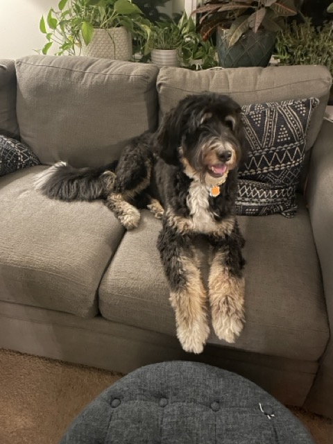 Daisy is an energetic 4 year old Bernedoodle. She loves to play and frequently demands belly rubs. She is very sweet and would love to snuggle with you in bed. However, she is 65 pounds and quite strong. She is also reactive to other dogs while on walks, so you must be confident you can control her. Experience with large dogs is strongly preferred.